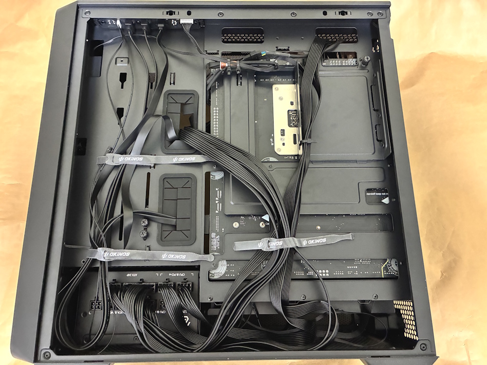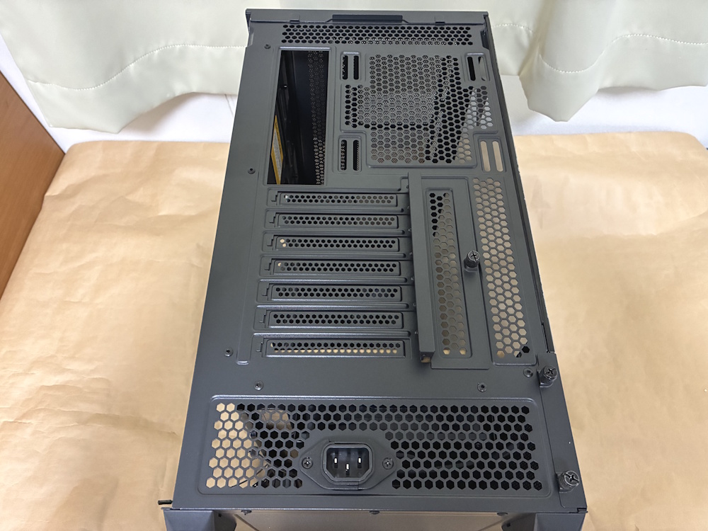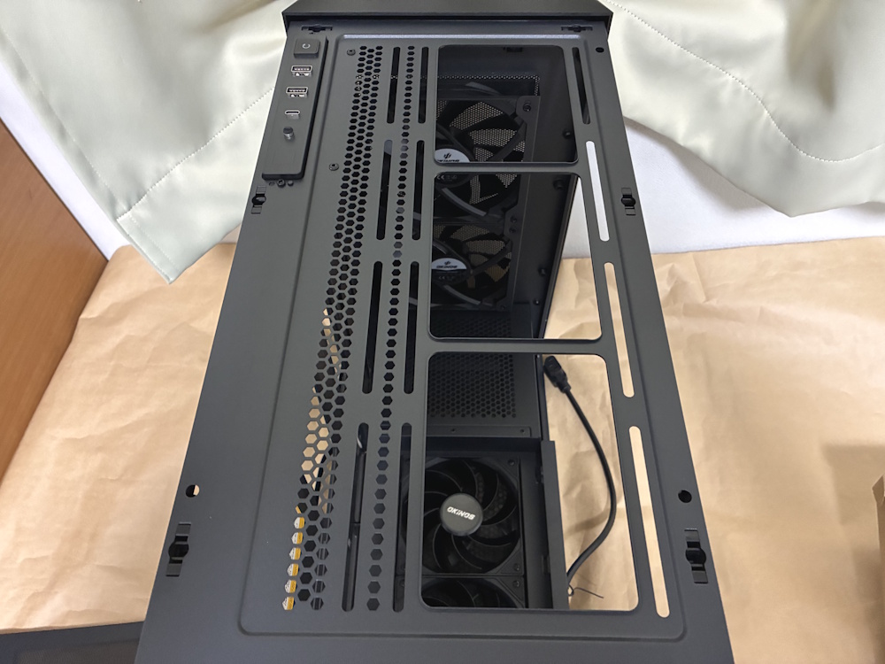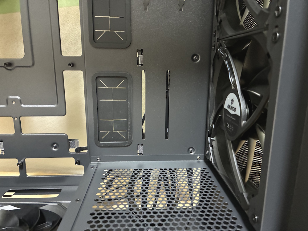 ケース背面側の下部(リバースファン)の下にケーブルを突っ込むこともできますが、接触の可能性に注意が必要です。