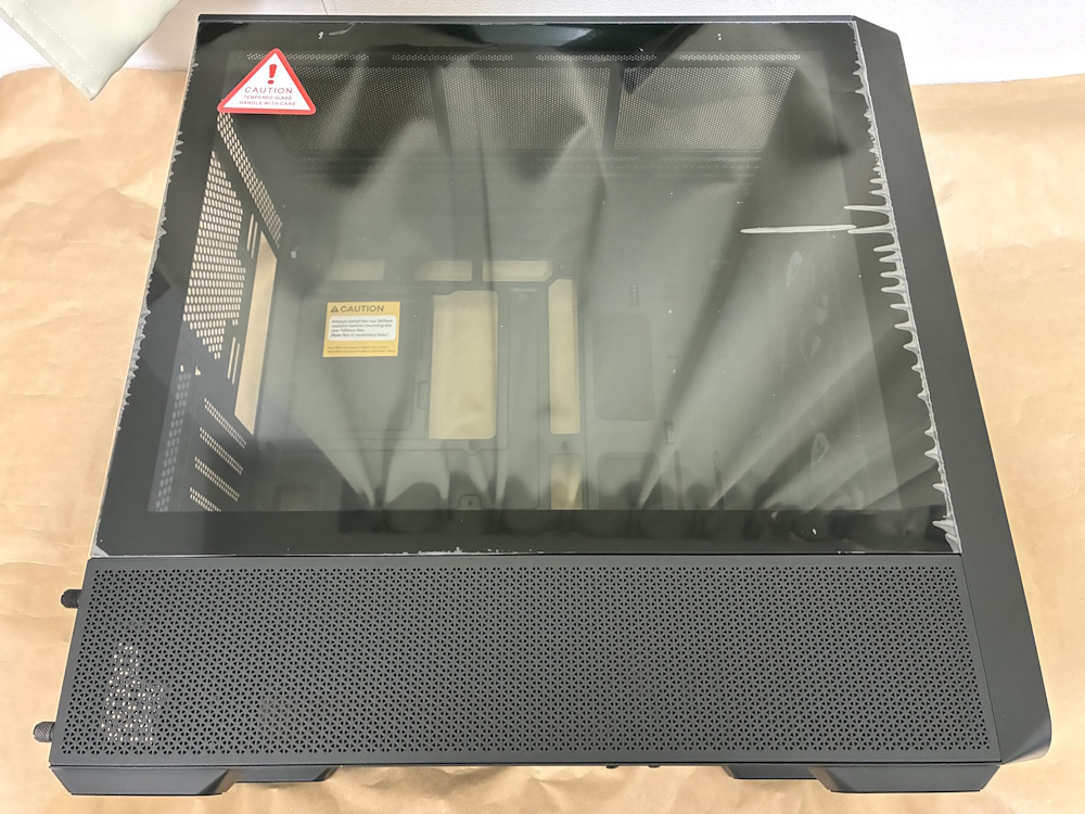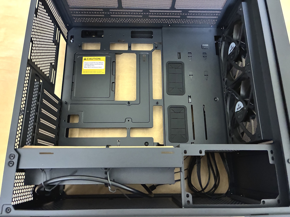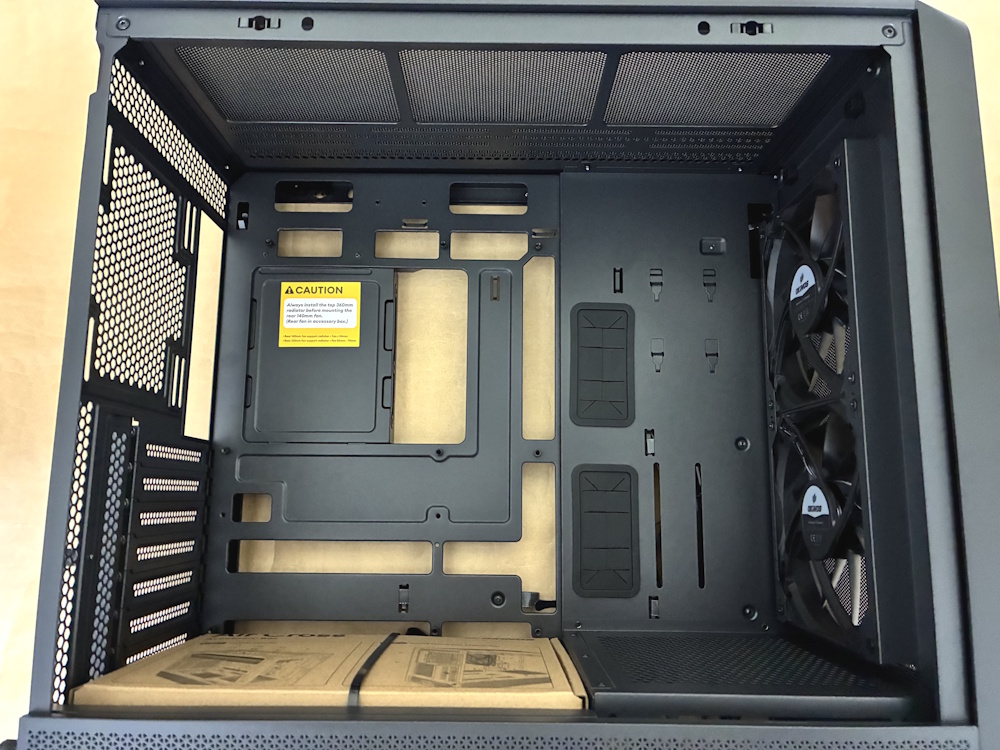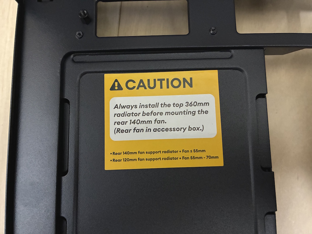 ケース内部左上に貼られているシールはトップに360mmラジエーターを取り付ける場合の注意書きです。
