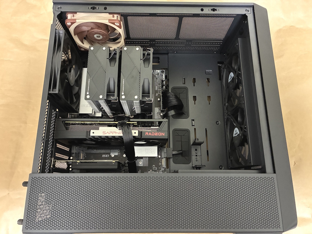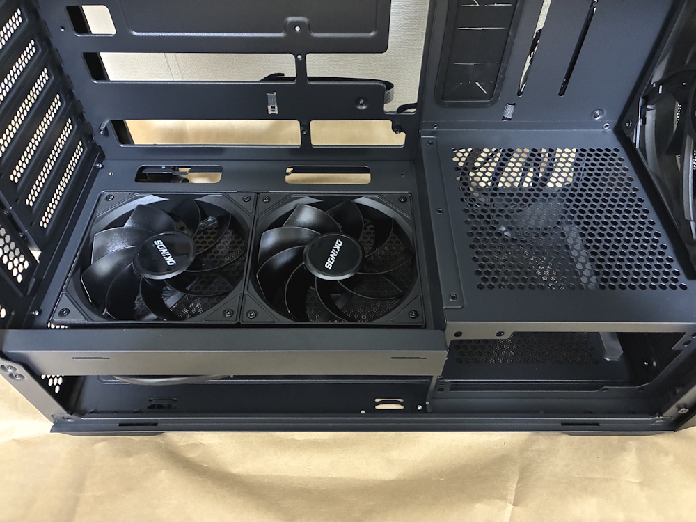 リバースファン2個があるおかげで、ビデオカード(GPU)やPCIeスロットに接続したSSDの冷却性能はかなり期待できます。