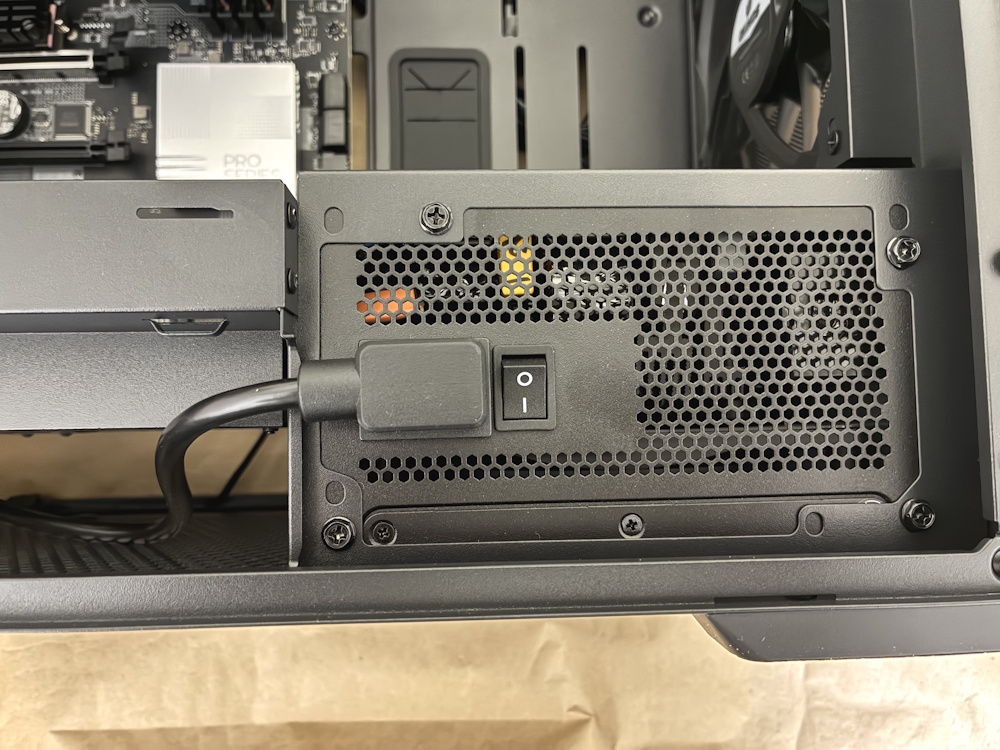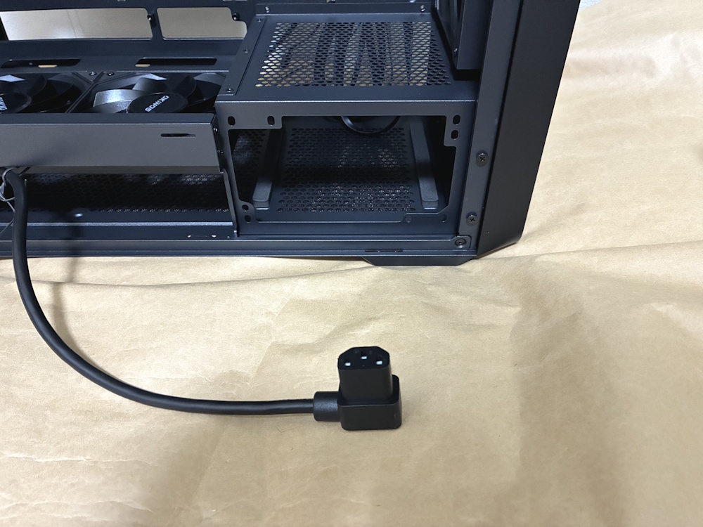 背面側から電源用のケーブルが伸びていて、前方下部に電源ユニットを設置する形です。