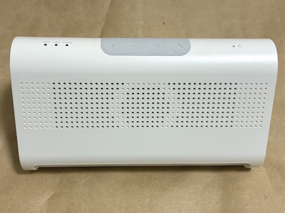 左の穴はマイク、電話マークは応答/SYNCボタン、その右は通話終了/ミュートボタン、音量ボタン、右側の3つはステータスLED、LAN LED、Disk LEDです。