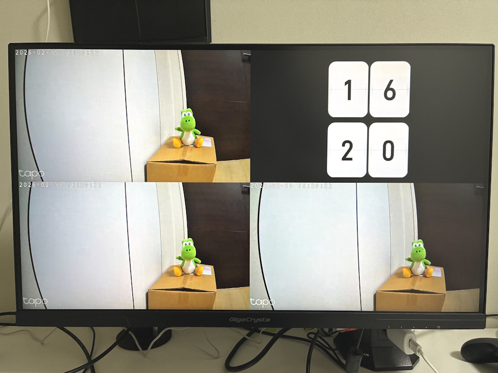 現在接続しているカメラが1台なので、説明用に同じ画像を3枚と時計を表示していますが、複数台のカメラがある方は同時に4画面表示(もちろん別々の映像を表示)できます。