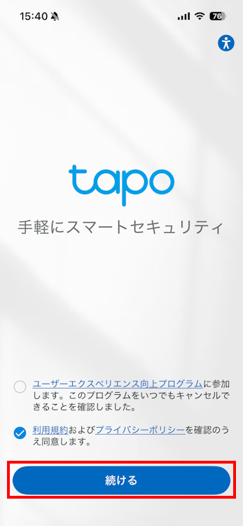 4.利用規約とプライバシーポリシーを確認>チェックを入れて続けるをタップ。