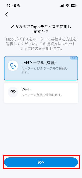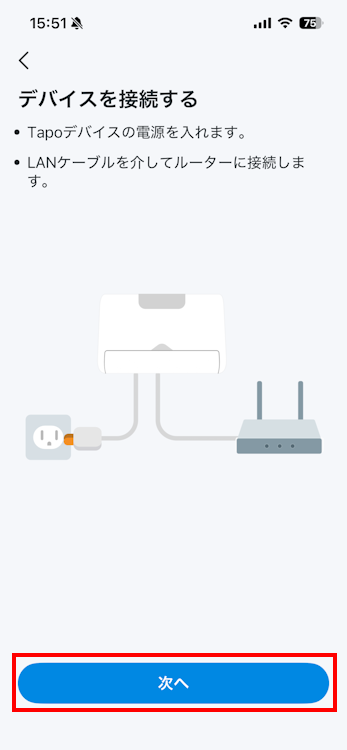 10.ルーターと本体がLANケーブルで接続されていることを確認>次へをタップ。