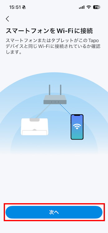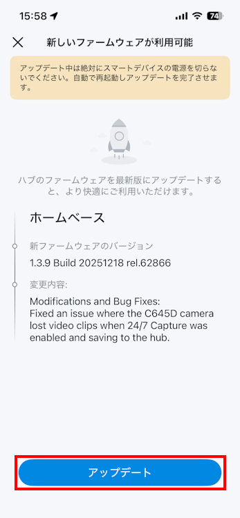 17.ファームウェアアップデートの案内が出た場合はアップデートをタップ>アップデートが終わるのを待ちます>終わったら次へをタップ。