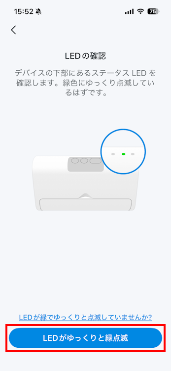 13.本体のLEDを確認>LEDがゆっくりと緑点滅をタップ。