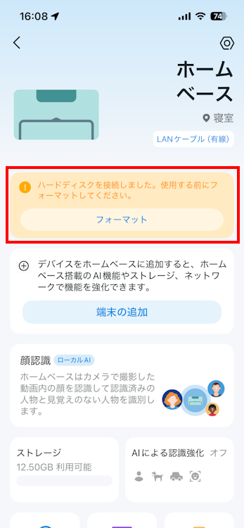 20.2.5インチHDD・SSDを増設した方はTapoアプリのホームでデバイス名をタップ>フォーマットをタップ。
